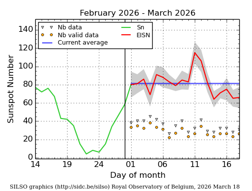 1. The Daily Estimated Sunspot Number: provides the daily value for the the Estimated International Sunspot Number (EISN), which is obtained by a simple average over available sunspot counts from prompt stations in the SILSO network. The raw values from each station are scaled using their mean annual personal reduction coefficient, K, over the last elapsed year. Therefore, compared to the monthly international sunspot number (produced on the first day of each month), the accuracy of the EISN is lower because the calculation rests on a smaller number of stations and the K scaling coefficient is only an approximation of the true K coefficient of the month. The EISN is computed every few minutes and thus evolves continuously as new observations from our worldwide network are entered into our database. Therefore, the EISN gives a dynamical preview of the final sunspot number but is an ephemeral product. It should not be archived for long-term use. At the end of each month, those values are dropped and replaced by the provisional sunspot numbers from the full calculation for the corresponding month. |